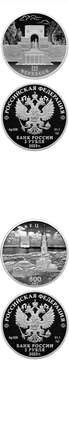 Аверс: рельефное изображение Государственного герба Российской Федерации, над ним вдоль канта – надпись полукругом «РОССИЙСКАЯ ФЕДЕРАЦИЯ», обрамленная с обеих сторон сдвоенными ромбами, под гербом слева – обозначения драгоценного металла и пробы сплава, справа – содержание химически чистого металла и товарный знак монетного двора, внизу в центре в три строки – надпись «БАНК РОССИИ», номинал монеты «3 РУБЛЯ», год выпуска «2025 г.».