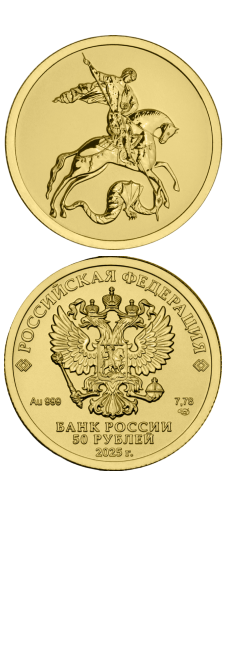 Золотая монета номиналом «50 рублей» (каталожный № 5216-0060), имеет форму круга диаметром 22,60 мм, масса драгоценного металла в чистоте 7,89 г, проба серебра 999/1000.