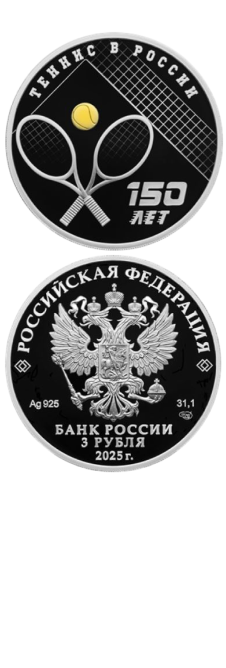 рельефное изображение Государственного герба Российской Федерации, над ним вдоль канта – надпись полукругом «РОССИЙСКАЯ ФЕДЕРАЦИЯ», обрамленная с обеих сторон сдвоенными ромбами, под гербом слева – обозначения драгоценного металла и пробы сплава, справа – содержание химически чистого металла и товарный знак монетного двора, внизу в центре в три строки – надпись «БАНК РОССИИ», номинал монеты «3 РУБЛЯ», год выпуска «2025 г.».