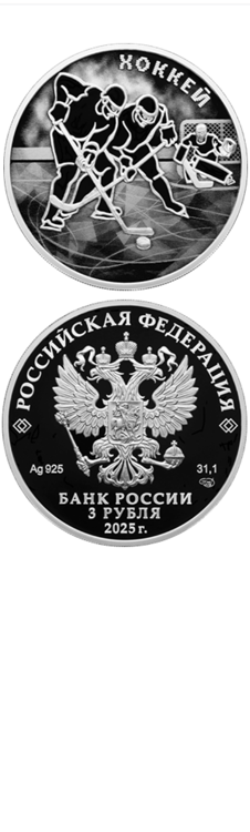 Реверс: рельефные изображения двух хоккеистов, борющихся за шайбу, и вратаря на фоне выполненного в технике лазерного матирования изображения ворот; вверху справа по окружности – надпись «ХОККЕЙ».