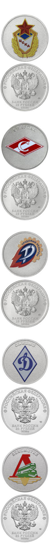 —ЦСКА-монета номиналом «25 рублей» (каталожный No 5015-0074), имеет форму круга диаметром 27,00 мм, масса драгоценного металла в чистоте 10,00 г, медно-никелевый сплав.