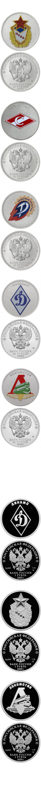 — Серебряная монета «ЦСКА» номиналом «1 рубль» (каталожный № 5109-0132), имеет форму круга диаметром 25,00 мм, масса драгоценного металла в чистоте 7,78 г, проба сплава серебра 925/1000.